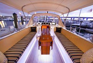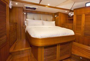 Six guests can enjoy true comfort in three spacious, well-appointed cabins. Each has seven-foot headroom and sound systems; the aft master cabin also has a flat-screen TV in addition to a center line king berth with custom 76″ mattress.
